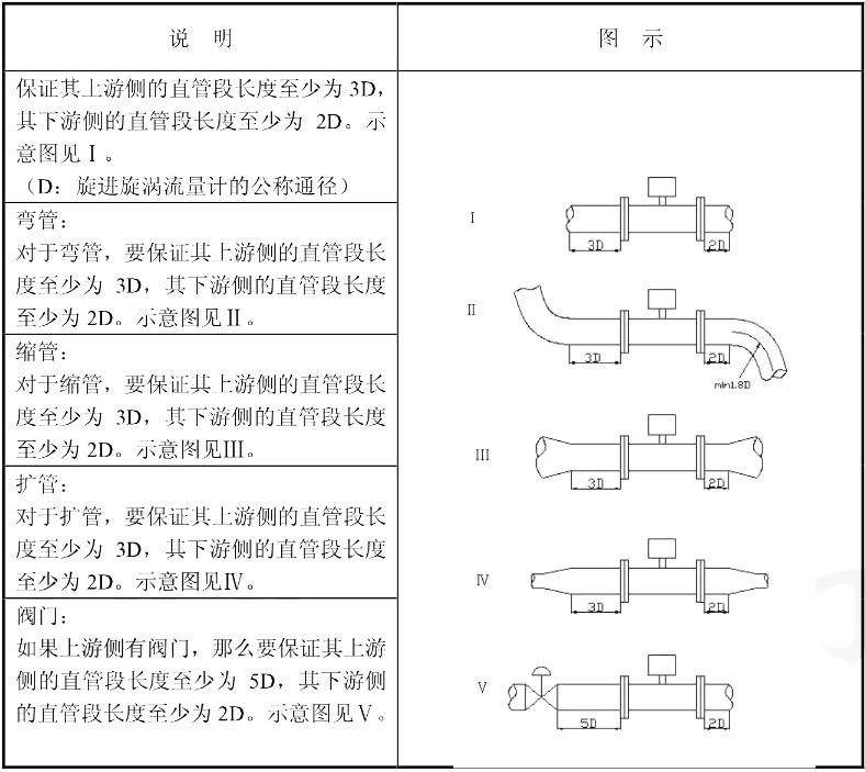 根據(jù)旋進(jìn)旋渦流量計(jì)的工作原理和流量計(jì)對(duì)上、下游直管段要求,對(duì)不同的上游阻力件,建議采用正確的前后直管段長度,且保持直管段內(nèi)壁光滑平直。那下邊小編就用表格的方式為大家介紹前后直管段長度的安裝要求?!?